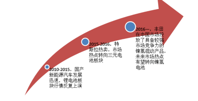 东莞证券分析,受到以比亚迪为代表的国产新能源汽车(主要应用磷酸铁锂正极电池)热销的影响,2014-2015年锂电池板块行情反复上演;而在特斯拉(主要应用三元材料正极电池)产品取得巨大成功后,市场热点在2015年底-2016年初转向三元电池板块。未来二级市场热点有望转向镍氢电池。