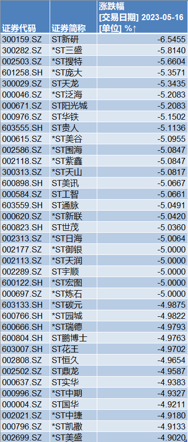 更早的5月9日,跌幅超过4.9%的ST个股高达64只。其中,*ST三盛(300282)、*ST红相(300427)、ST迪威迅(300167)等44只ST股票跌幅在5%以上。5月8日,同样有超50只ST股票跌幅超过4.9%。